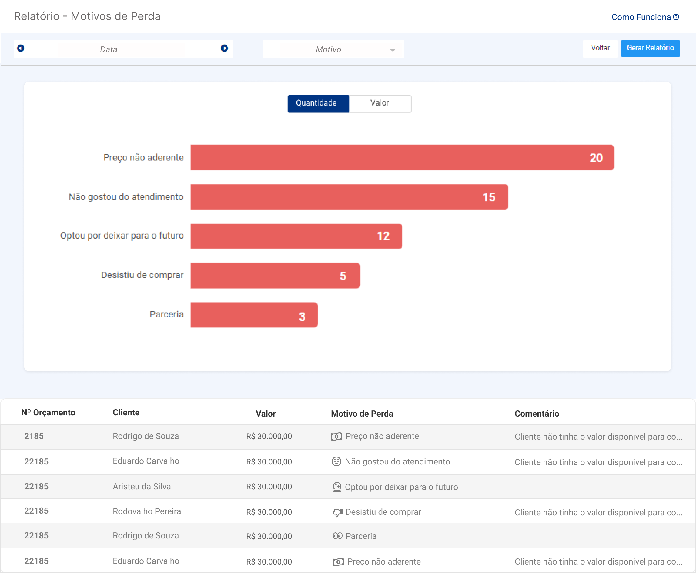 Gráfico de Barras Horizontal: O sistema exibe um gráfico com os motivos de perda, permitindo alternar entre visualizar por Quantidade ou Valor. Cada barra representa um motivo, com a quantidade ou o valor de orçamentos cancelados.