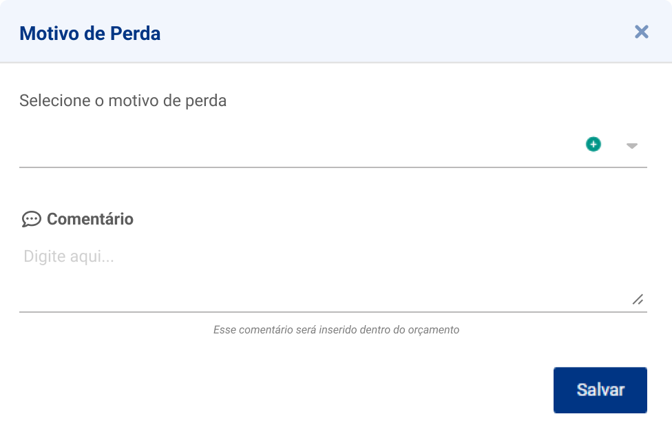 Seleção do Motivo de Perda: Você poderá selecionar um motivo de perda a partir da lista de motivos previamente cadastrados. Caso ainda não tenha registrado motivos, o sistema avisará e permitirá um cadastro rápido.