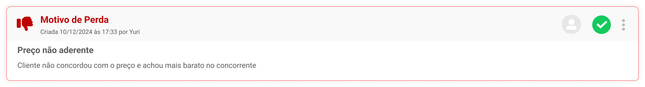 Registro no Orçamento: O motivo de perda e o comentário serão registrados diretamente no orçamento, na seção de Tarefas