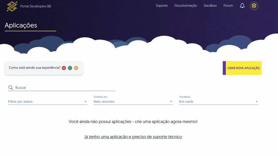 Após feito o login no portal developer será necessário criar sua aplicação para isso clique em "CRIAR NOVA APLICAÇÃO".