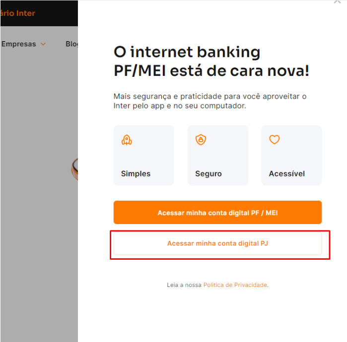 O primeiro passo para realizar a integração com o WebService, é acessar a sua conta do Banco Inter, utilizando uma conta de pessoa Jurídica: