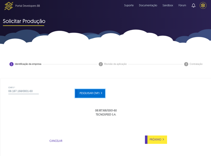 Preencha o campo "CNPJ" com os dados da empresa e clique em "PESQUISAR CNPJ" caso a empresa seja correntista BB aparecerá sua razão social e CNPJ abaixo e então clique em "PROXIMO".
