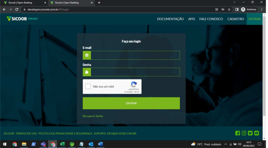 a) Faça login no Portal Developers (https://developers.sicoob.com.br).