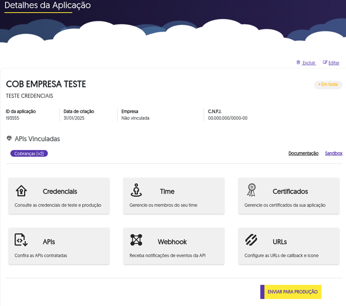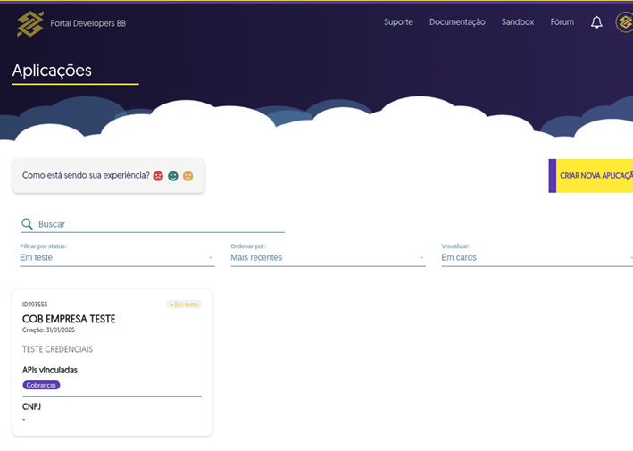 Clique sobre a área da API criada e então você será redirecionado a pagina de detalhes da aplicação, para obter as credenciais de homologação basta clicar em "Credenciais".
