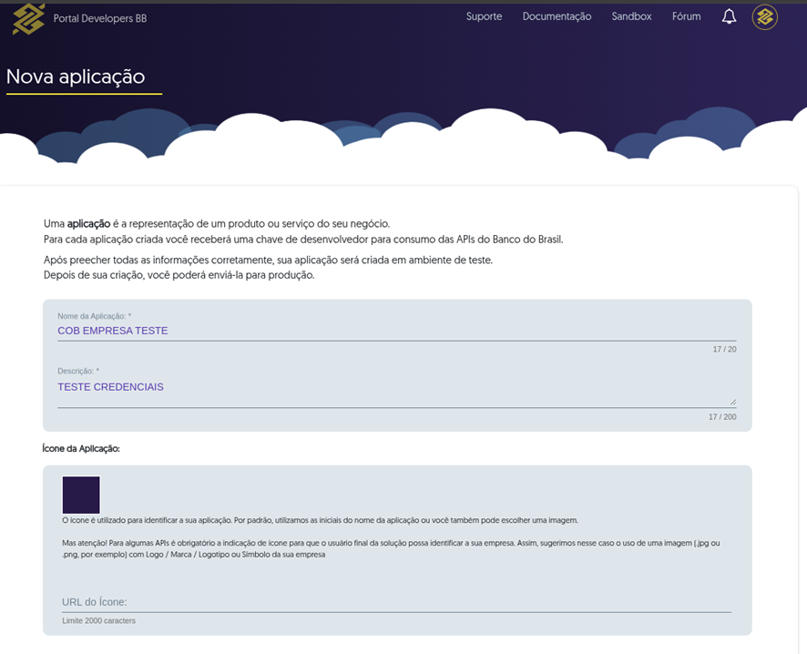 Escolha um nome e descrição para a nova aplicação que será criada, esses dados nao influenciam na cobrança portanto pode ser preenchidos com qualquer dados.