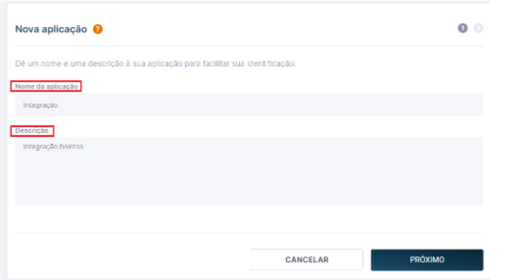Após acessar este campo, você vai precisar definir um nome e descrição para sua aplicação. Importante ressaltar que este campo é livre, e você pode preenche-lo da maneira que considerar melhor, visto que, seu preenchimento tem apenas a finalidade de manter um controle sobre as aplicações que comunicam com o Inter. Portanto, é necessário apenas preencher os campos e depois selecionar o botão "Próximo".