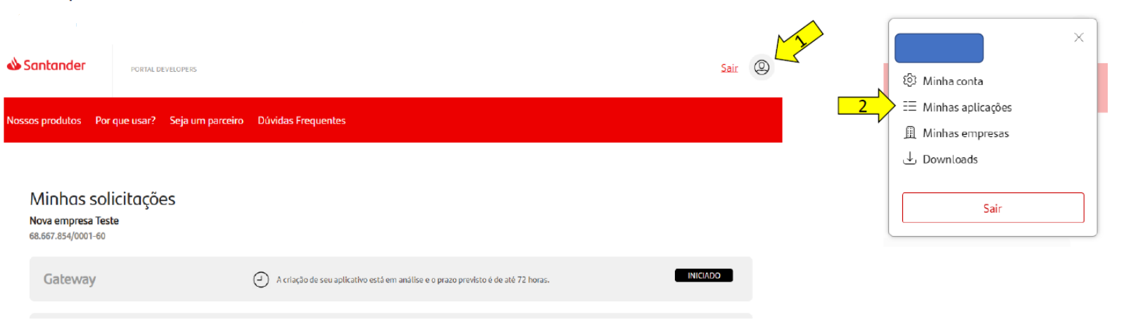Passo 10: Uma vez logado no portal de desenvolvedor como Usuário Master acesse ícone de opções de usuário (no canto superior direito) e clique em “Minhas aplicações”