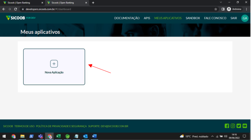 b) É necessário cadastrar uma aplicação para a geração da credencial, para isso clique em “Nova Aplicação”.