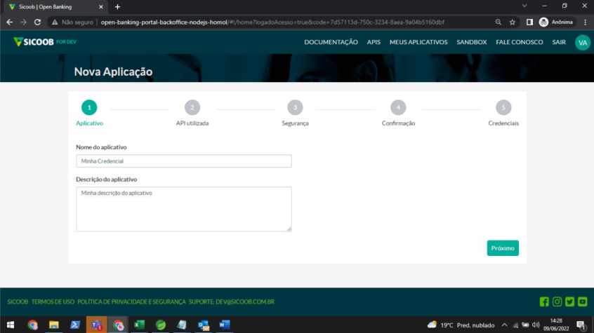 e) Pronto, agora você pode seguir com o cadastro do seu aplicativo. Para informe: Nome, Descrição e clicar em “Próximo”.