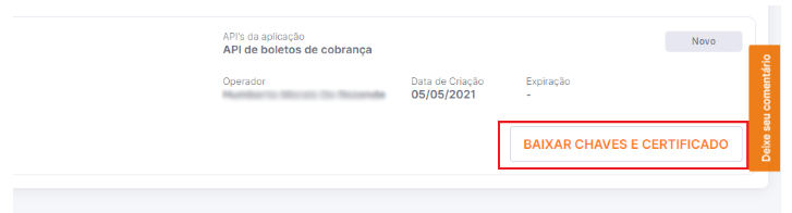Após finalizar o passo anterior, sua aplicação vai ser criada com sucesso, e para completar a integração será preciso selecionar a opção "Baixar chaves e certificados".