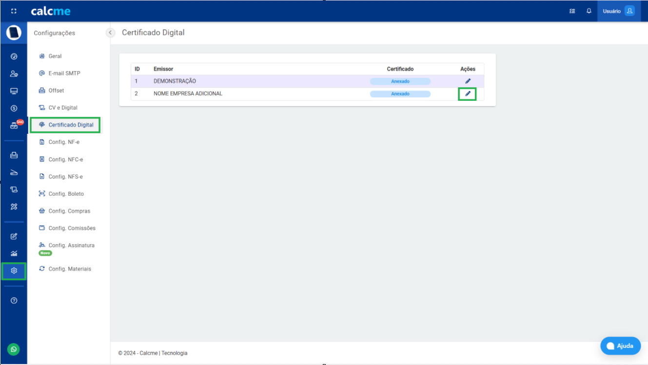 - Em Configurações, selecione Certificado Digital e clique no ícone de lápis para adicionar o certificado e a senha.