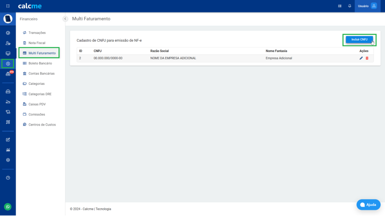 O módulo Multi Faturamento no sistema Calcme foi desenvolvido para permitir que as empresas emitam notas fiscais a partir de mais de um CNPJ, integrado ao módulo financeiro. Essa funcionalidade é especialmente útil para empresas que possuem filiais ou diferentes entidades jurídicas e desejam centralizar a emissão de notas fiscais no sistema.
