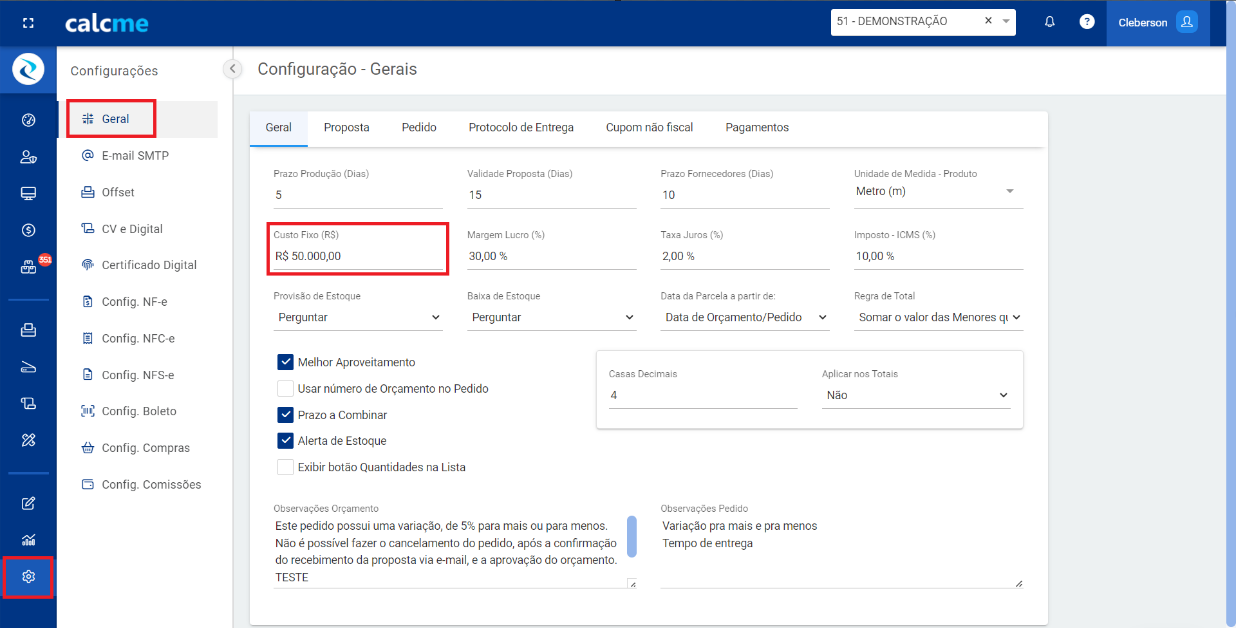 Acesse: Configurações/Geral e na aba Geral digite o valor desejado no campo Custo Fixo (R$)