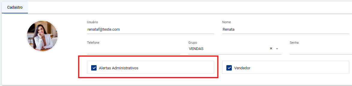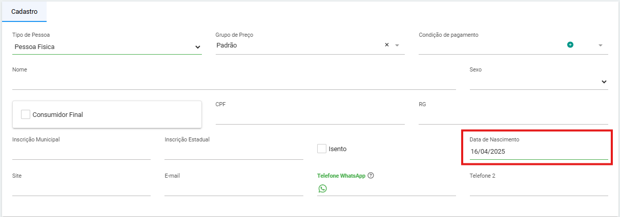Tipo de cadastro igual a Cliente, Vendedor, Funcionário ou Parceiro.