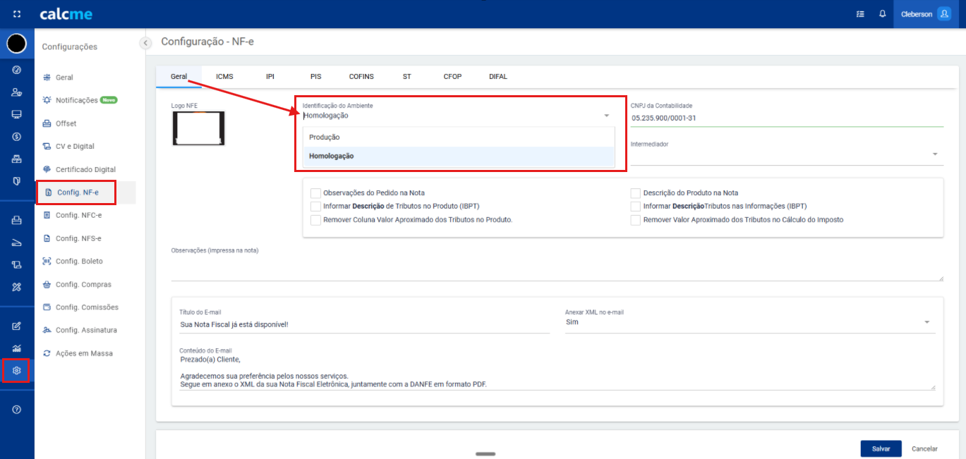 Passo 1: Para passar a emitir as notas efetivamente, você deve mudar nas configurações de NF-e o ambiente para produção, como no exemplo a seguir:
