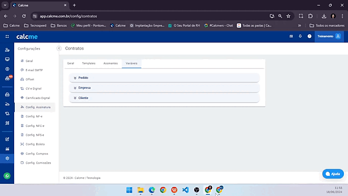 Na aba "Variáveis" teremos as variáveis disponíveis para copiarmos e podermos editar nosso template do contrato, variáveis relacionadas aos "Pedidos", "Empresa" e "Cliente".