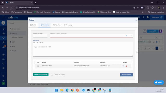 No menu geral do calcme clicando em "Configurações" e indo em "Config. Assinatura" na aba "Geral" temos o campo (texto) de "Mensagem" que podemos configurar a nossa mensagem de saudação, que será enviada juntamente com contrato para assinatura tanto por e-mail ou por WhatsApp.