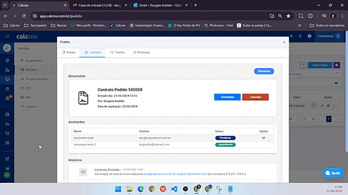 Assim que ambas partes realizam a assinatura digital irá alterar para "Finalizado" status geral do contrato e temos a opção de efetuar o "Download" ou "Cancelar".