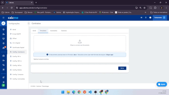 Na aba "Templates" podemos subir nossos modelos de templates de contrato tanto de fornecedores, funcionários, contrato de prestador de serviços entre outros. Para anexar seu modelo de template basta ir no campo "Clique ou arraste seu Documento".