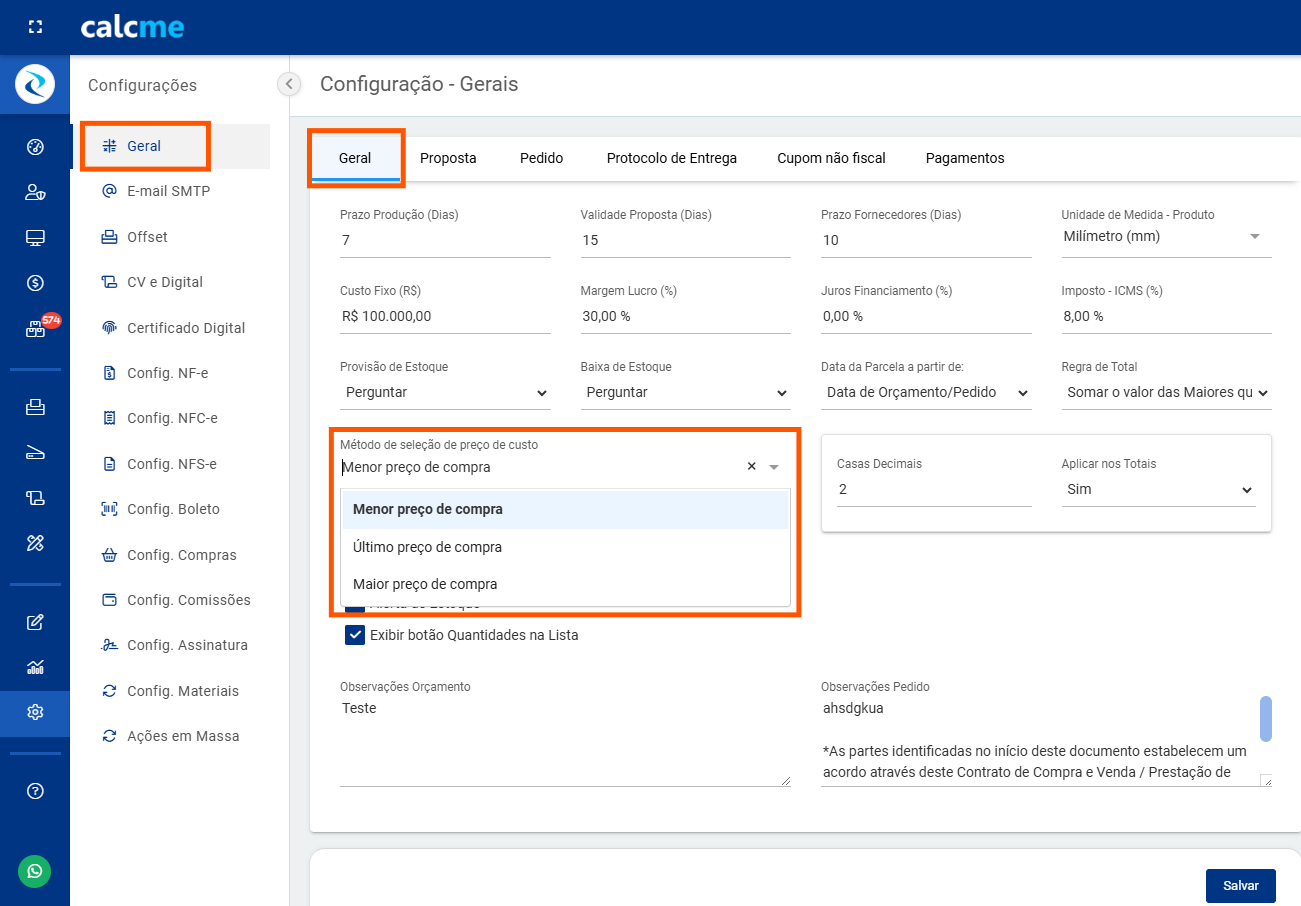 Além da configuração geral, cada item agora possui um novo campo onde você pode definir individualmente qual método de cálculo deseja aplicar.