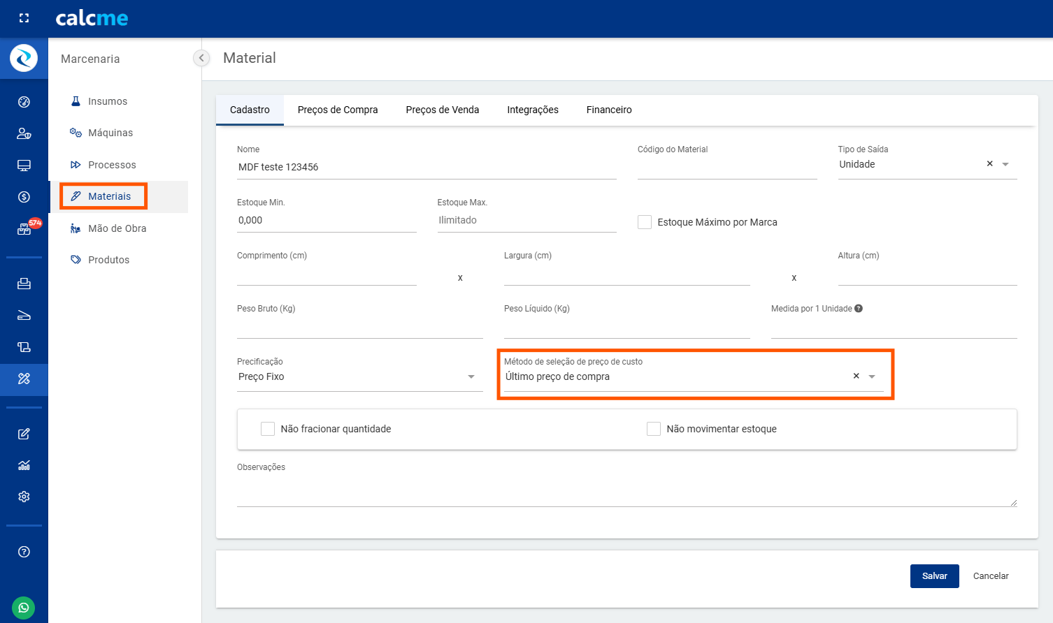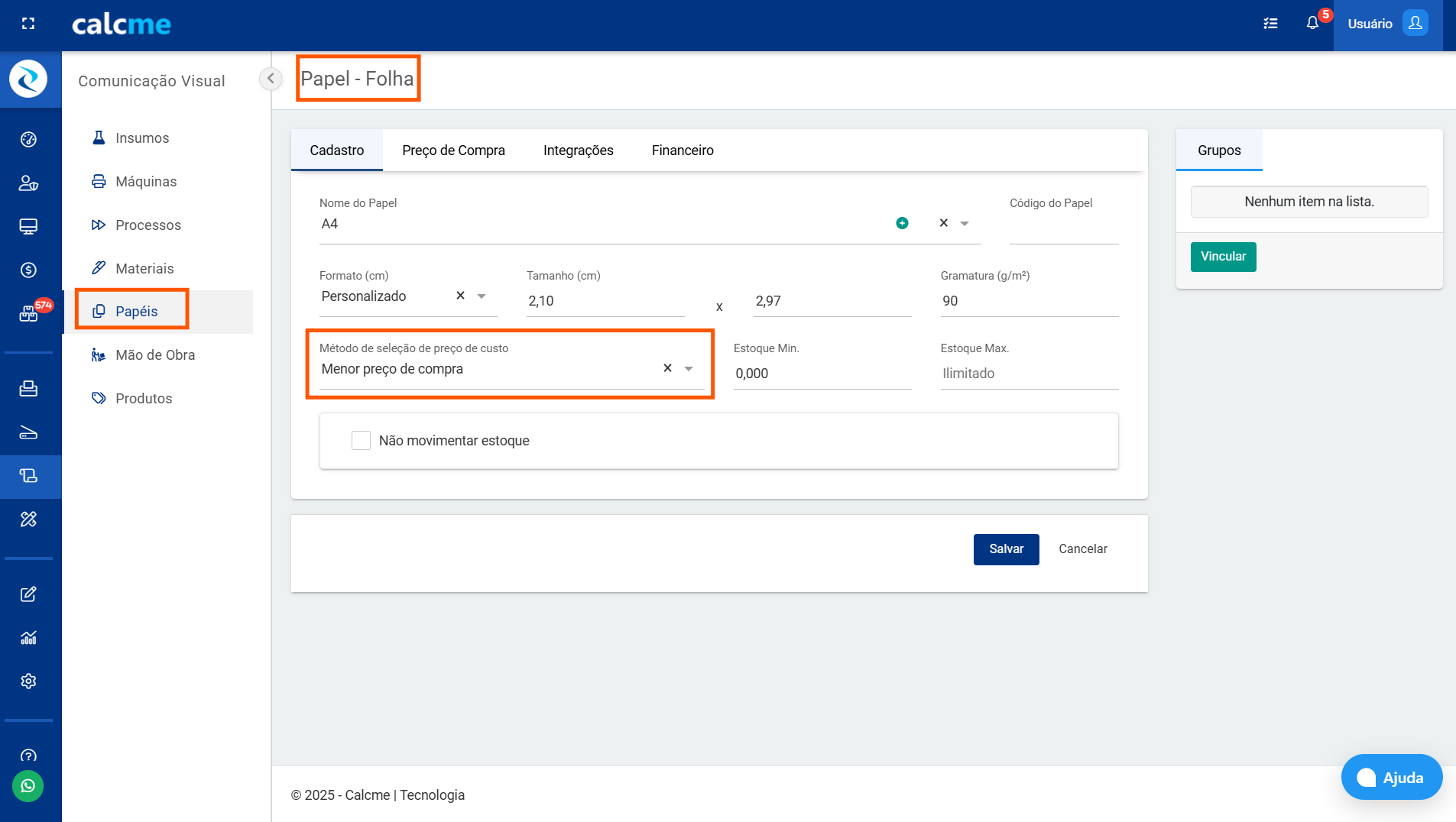 Agora no Calcme, você pode escolher como deseja calcular o preço de custo de cada Insumo, Material, Papel ou Produto Simples, proporcionando maior flexibilidade na precificação e garantindo que sua estratégia de formação de preços esteja alinhada com a realidade do seu negócio.
