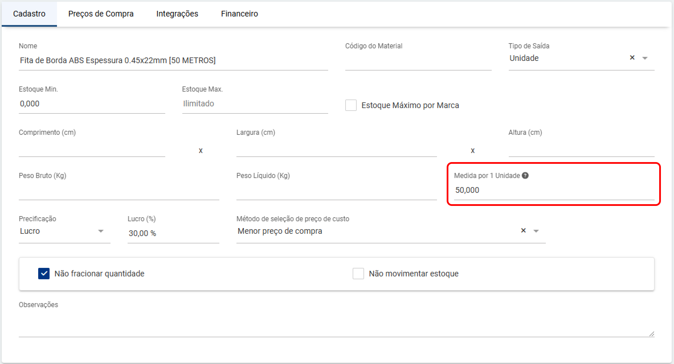 O campo "Medida por 1 Unidade" está disponível no formulário de cadastro de materiais.