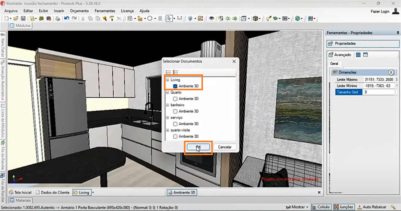 Deixe marcado o ambiente que deseja orçar e clique em "OK":