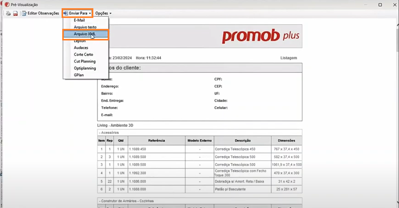 Após isso, o Promob irá mostrar o arquivo, nessa hora clique sobre a opção "Enviar Para", depois em "Arquivo XML" e salve em seu computador: