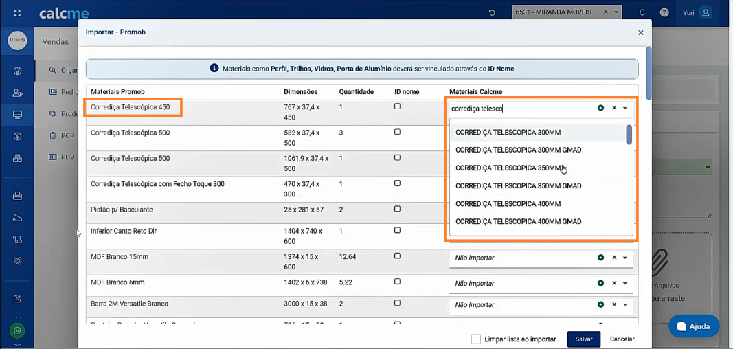 Após abrir o arquivo pelo Calcme, o sistema irá lhe permitir gerenciar os materiais do projeto, vinculando o item do arquivo ao item já cadastrado previamente: