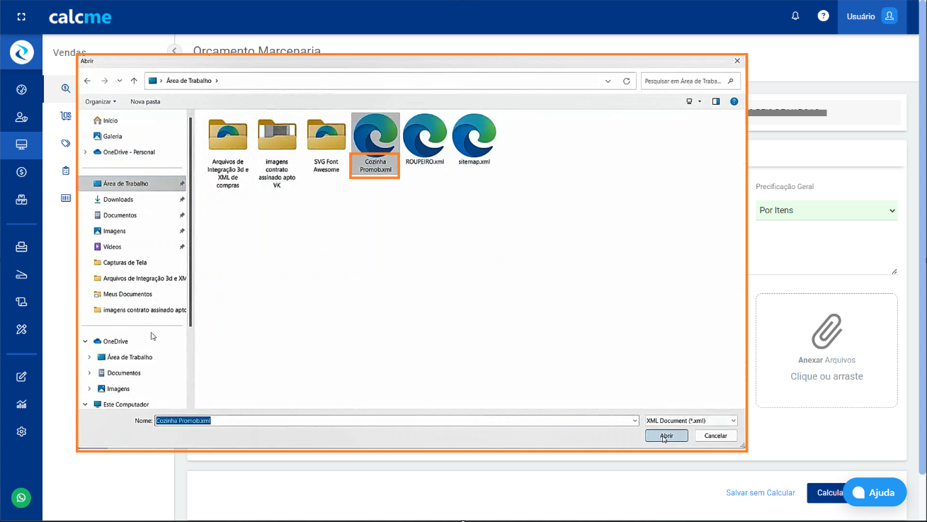 Após gerar o arquivo do seu projeto e salvá-lo em seu computador, inicie a criação do orçamento ou pedido.