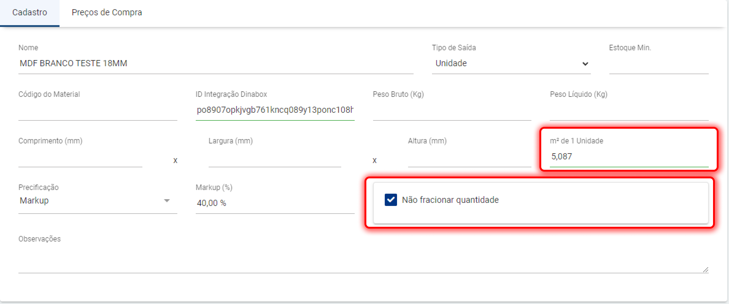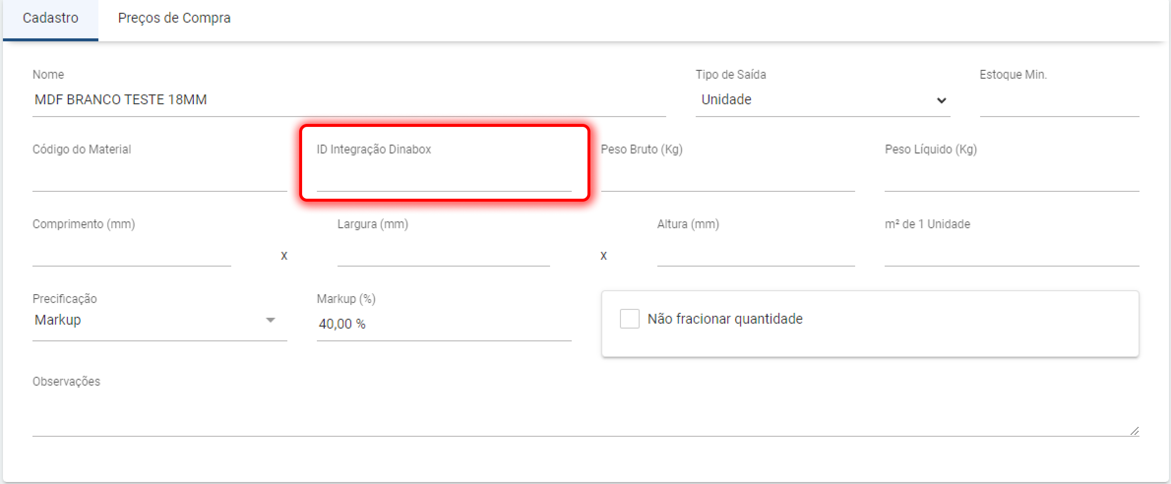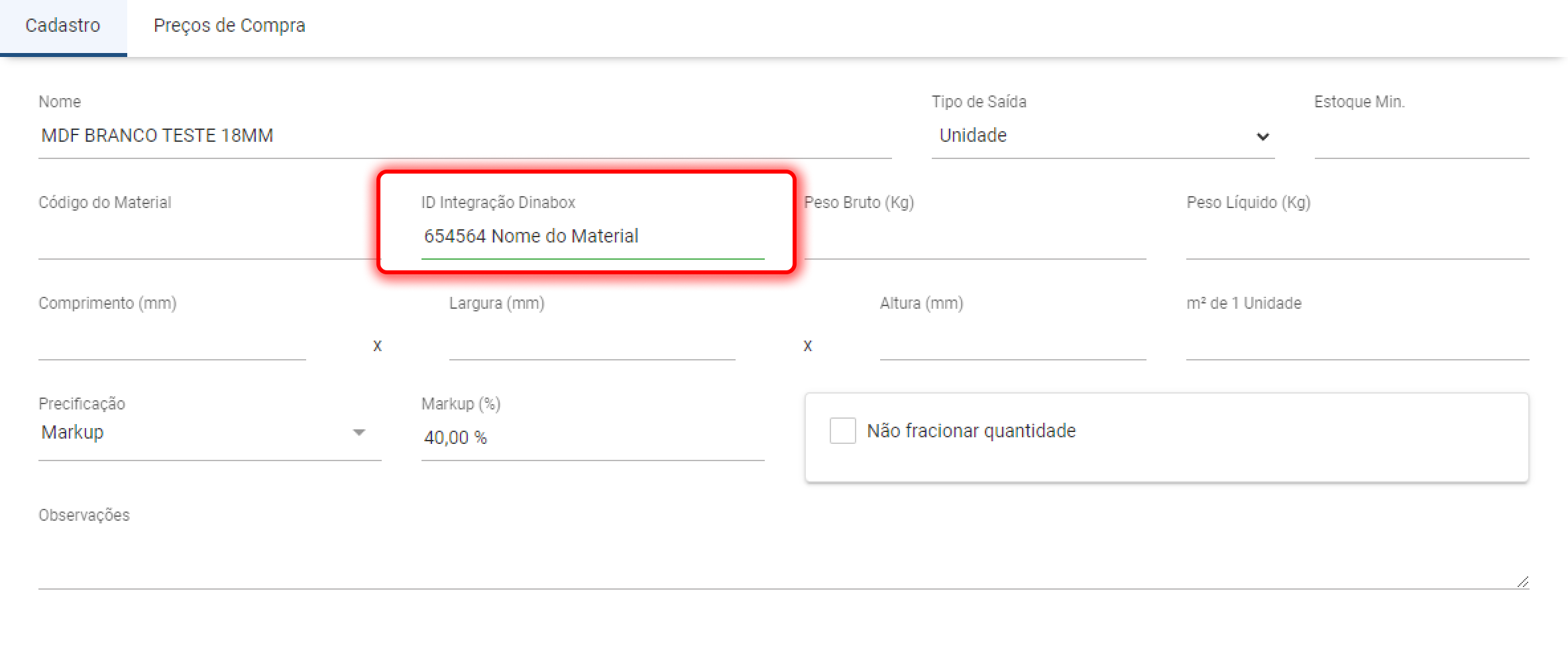 E depois colar esse nome inteiro (Exemplo: 654564 Nome do Material) dentro do campo "ID Integração Dinabox" dentro do material.