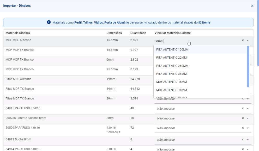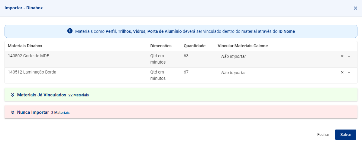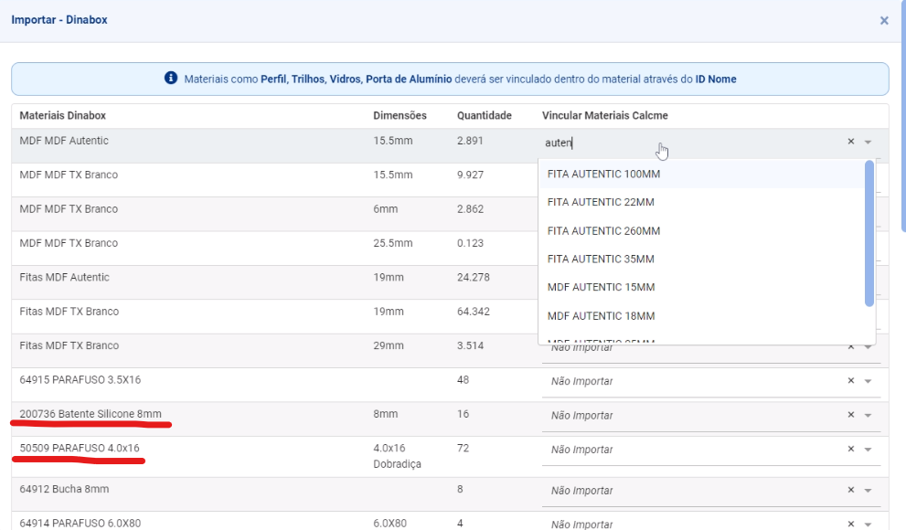 Criamos uma função muito útil para vincular os materiais do Dinabox aos materiais da Calcme na primeira importação que você fizer. Ao selecionar o vinculo do material, a calcme automaticamente preencher o ID do material dentro do cadastro, para identificar o material na próxima importação. Com essa função você precisa vincular o material apenas uma vez, e as próximas importações já buscam o material automaticamente.