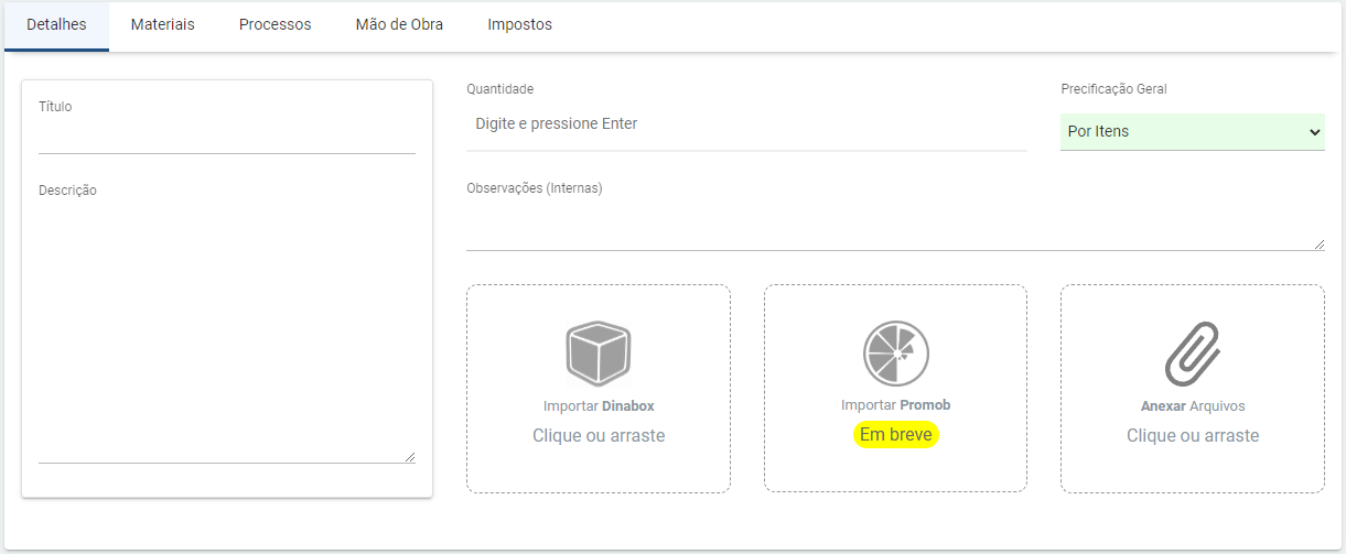 Existe ainda, duas funções importantes, a de "Não importar" quando você não deseja importar um material para orçamento ou pedido naquela vez. E ainda o "Nunca Importar" que ele não traz mais o material para importação nas próximas vezes.