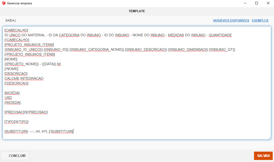 {{INSUMO_ID_UNICO}};{{INSUMO_ID}};{{INSUMO_CATEGORIA_NOME}};{{INSUMO_DESCRICAO}};{{INSUMO_DIMENSAO}};{{INSUMO_QT}}[/PROJETO_INSUMOS_ITENS]