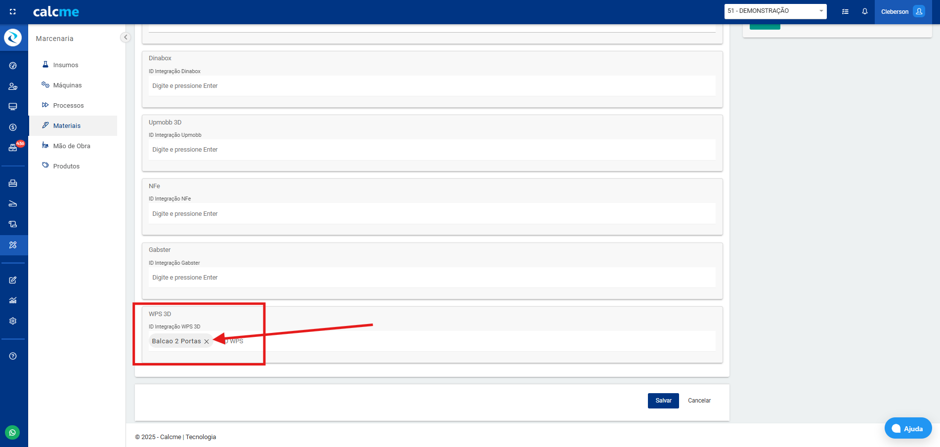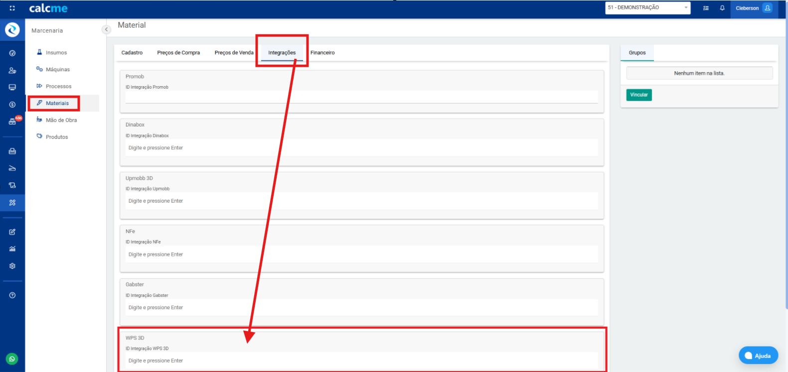 Dentro dos materiais possui um campo chamado "Integração" "WPS 3D" para preencher o ID de integração e vinculo.