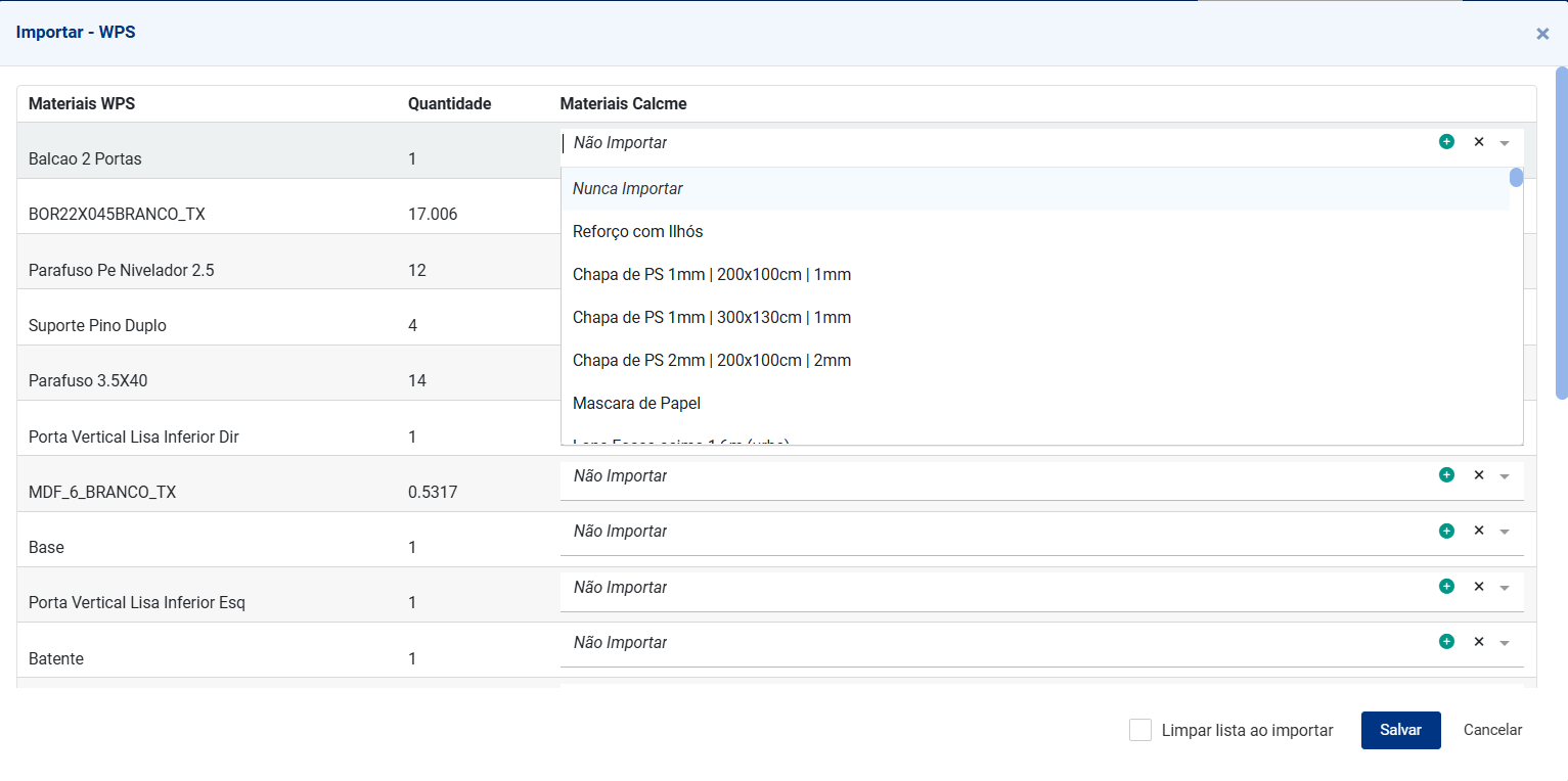 Criamos uma função muito útil para vincular os materiais do WPS aos materiais da Calcme na primeira importação que você fizer. Ao selecionar o vinculo do material, a calcme automaticamente preencher o ID do material dentro do cadastro, para identificar o material na próxima importação. Com essa função você precisa vincular o material apenas uma vez, e as próximas importações já buscam o material automaticamente.