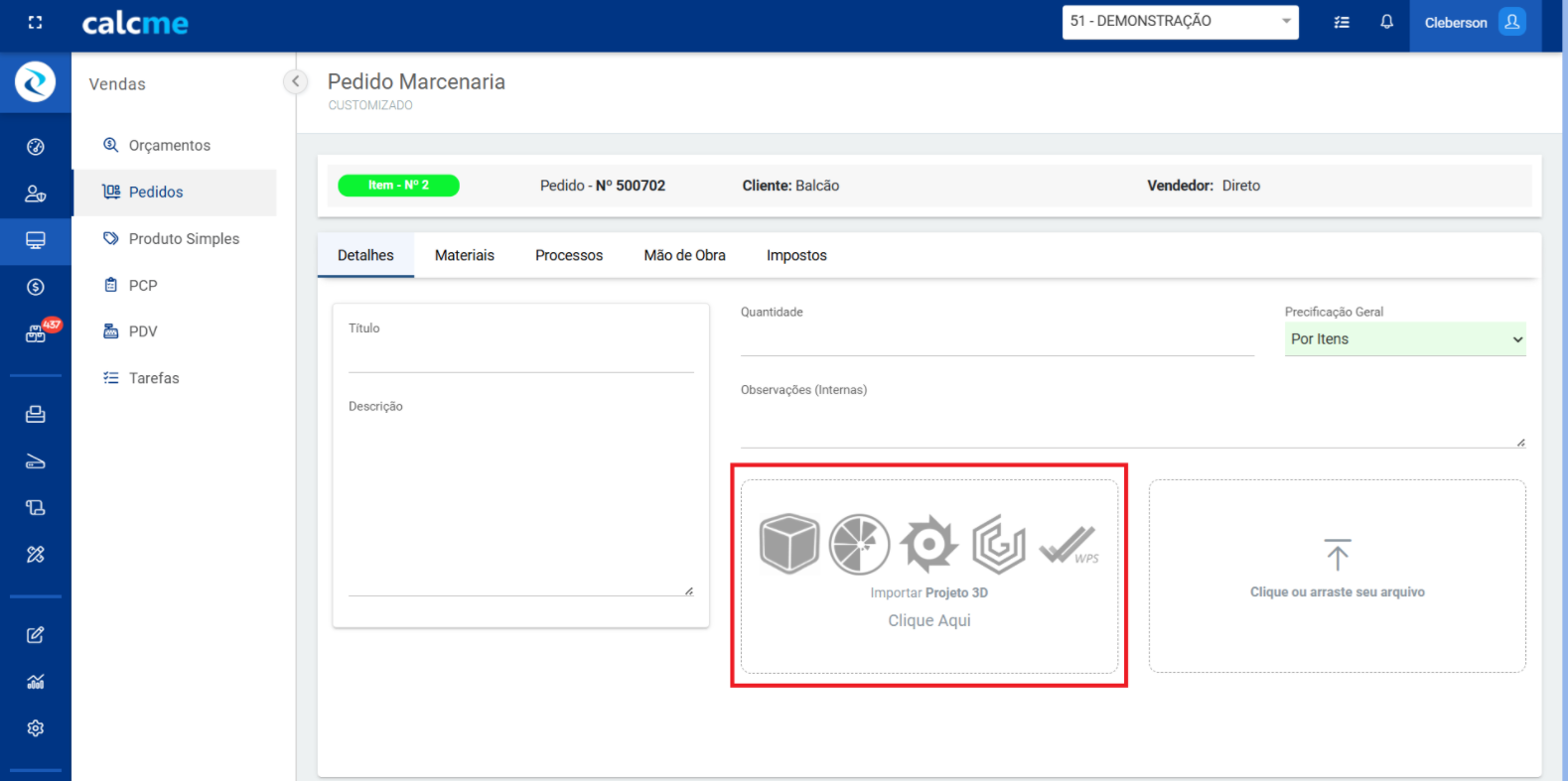 Para importar na calcme, você precisa criar um item de orçamento ou pedido, com o tipo de item "Marcenaria"
