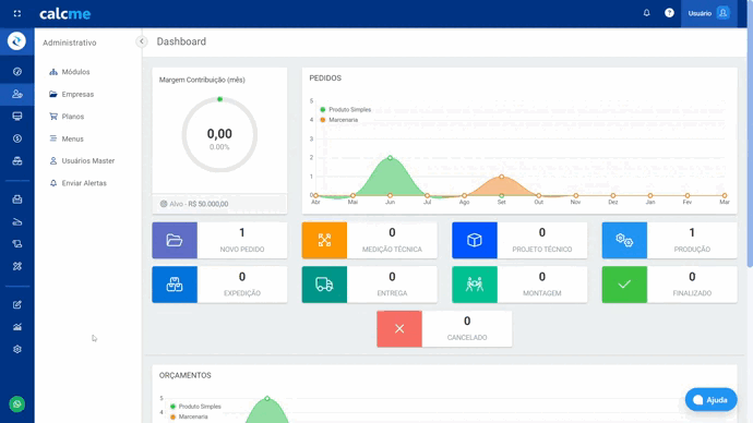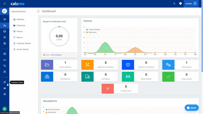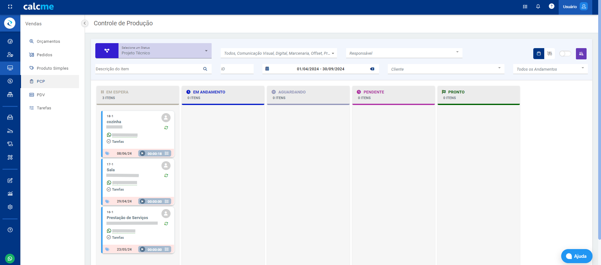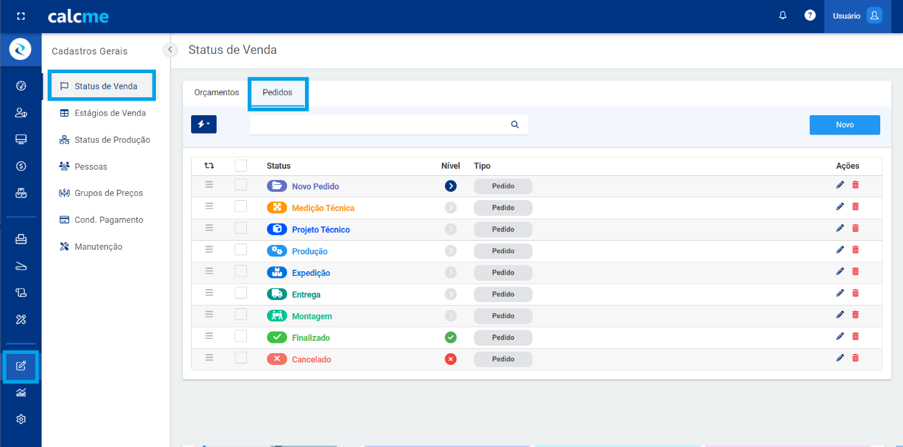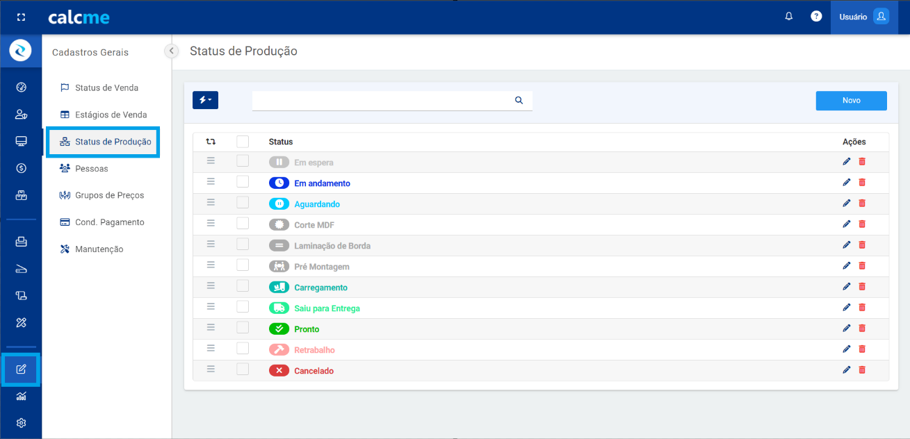 O gerenciamento no Calcme é separado em dois tipos de status, o e Venda e o de Produção.