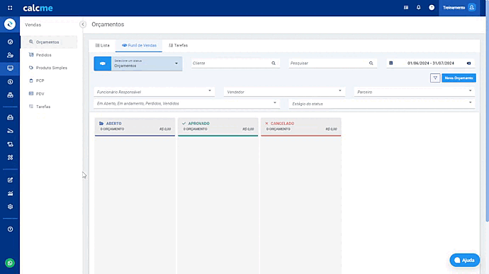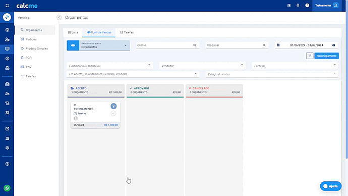 No menu "Vendas" selecione "Orçamentos", clique na aba "Funil de Vendas" irá clicar no canto direito em "Novo Orçamento" , após criar o orçamento com os repectivos dados e incluir (item), irá listar o (card) no status (inicial) "ABERTO". Com orçamento já criado podemos entrar no orçamento (card) criar tarefas, editar o (item) do orçamento, editar dados do cabeçalho do orçamento, adicionar anexos, enviar o orçamento via whatsapp (Chatme) e conversar com seu cliente.