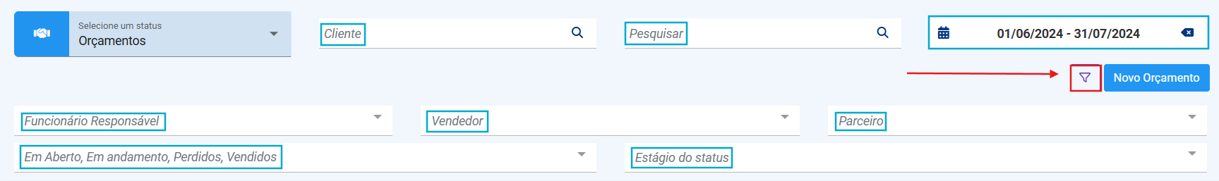 No canto direito ao lado de "Novo Orçamento" , temos como filtrar informações referente aos orçamentos criado, abaixo os tipos de filtros: