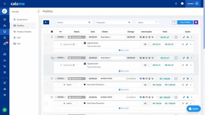 No Calcme você pode selecionar vários pedidos e lança-los todos de uma vez só no financeiro de forma agrupada.