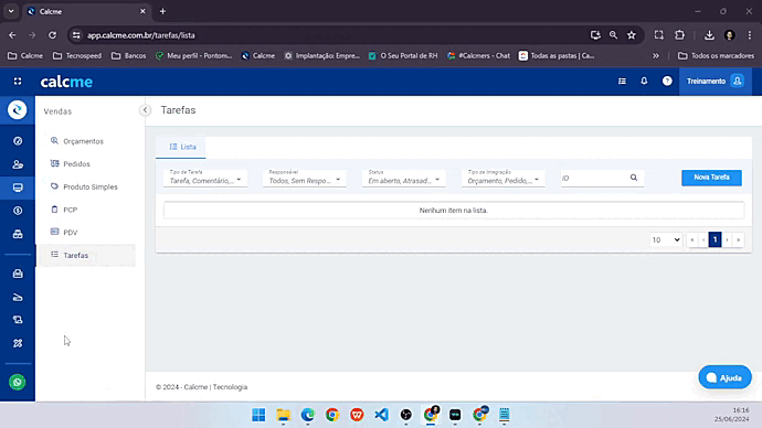 No menu Vendas selecione Orçamentos, irá clicar na aba "Tarefas" neste local teremos todas as tarefas criadas a partir dos orçamentos (card), teremos os filtros por "Tipo de Tarefa" , "Responsável", "Status" e por "ID". Temos também a possibilidade de criar uma "Nova Tarefa" e vincular ao respectivo orçamento.